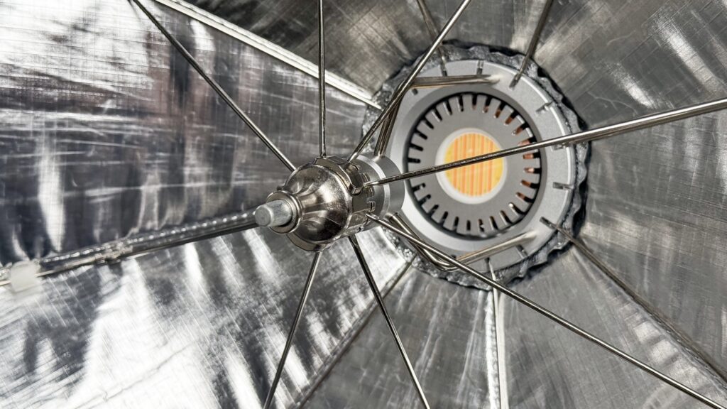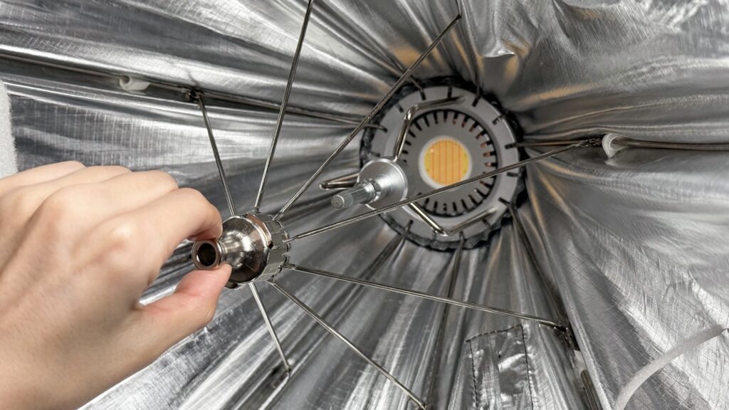 装着ができたらソフトボックス内の銀色の金具(手で持っている部分)を中心部に差し込みます。
