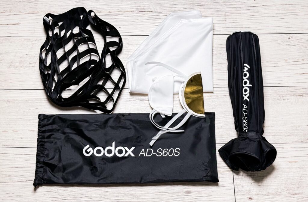 ソフトボックス(Godox AD-S60S)を購入すると画像の一式が届きます。セット内容は