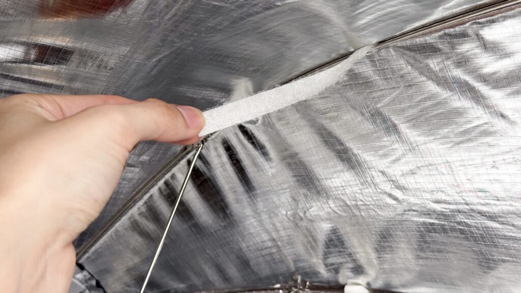 傘の内側に白いマジックテープが4本あるので、そこに貼り付けます。
